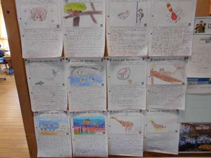 友達の書いた校外学習の振り返りを見て、「こんな動物いたね。」「たしかにフラミンゴは首を曲げて寝ていたね。」と話していました。