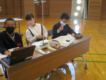 10月29日(金) 5年生 ふりこのきまり2 公開日 2021/10/29 更新日 2021/10/29 5年生 体育館で、ふりこの実験道具、タブレット、ストップウォッチ、プロジェクター、スクリーン等を使い、ダイナミックに学習しています。ステージ上で、長さ4メートルのふりこも使ってみんなで時間を測りました。ミニ動画→ふりこ3、ふりこ4