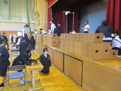 体育館で、ふりこの実験道具、タブレット、ストップウォッチ、プロジェクター、スクリーン等を使い、ダイナミックに学習しています。ステージ上で、長さ4メートルのふりこも使ってみんなで時間を測りました。ミニ動画→ふりこ3
