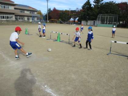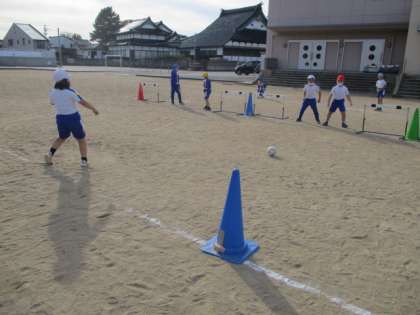3年生が体育で、シュートゲーム「卵わりサッカー」をしています。2人ペア対抗で、シュートして攻めたり守ったりする攻防戦を楽しみました。ミニ動画→卵わりサッカー2