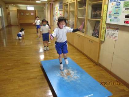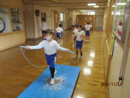 11月11日(木) 1年生 休み時間もなわとび 公開日 2021/11/11 更新日 2021/11/11 1年生 1年生が、休み時間にも一生懸命になわとび練習をしている様子です。廊下にあるジャンピングボードを使って、二重跳びを連続10回以上もする子もいます。ミニ動画→1年なわとび