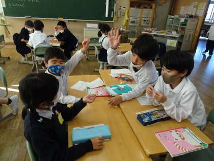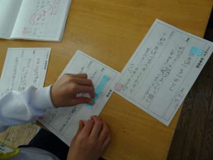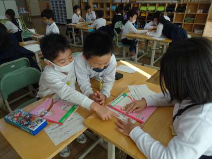 昨日の学習参観でできなかった、グループでの活動を行いました。自分の紹介したいことわざや故事成語のカードに付箋を付けて隠したものを互いに見せ合い、言葉や意味を答えたり教え合ったりしました。どんどん興味や関心が高まり、教室に置いている本を見る姿も増えています