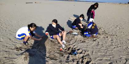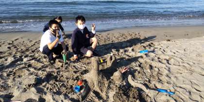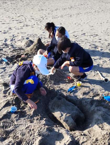 11月19日(金)、6年生とひまわり組の子供たちが、岩瀬浜で図画工作科の授業をしました。砂を集めたり掘ったり水で固めたりしながら、岩瀬ならではの造形活動を思い切り楽しみました。