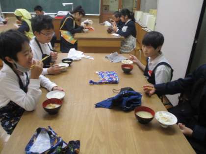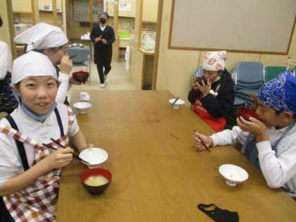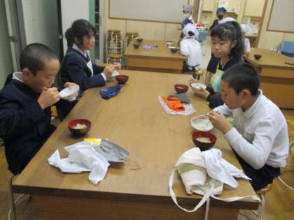 5年生が家庭科で、米を炊いて、味噌汁をつくりました。「少しごはんが焦げたけれど、なおさら香ばしかったよ」「油揚げと大根の味がおいしかったね」などと、満足そうに食べる5年生でした。