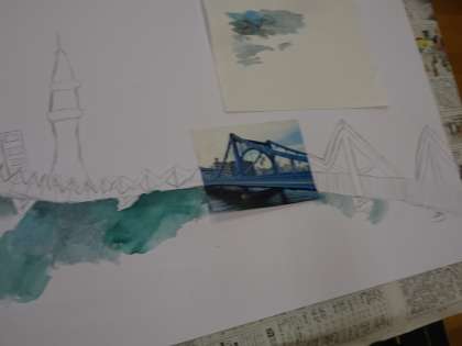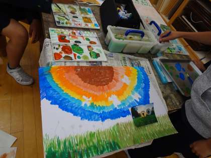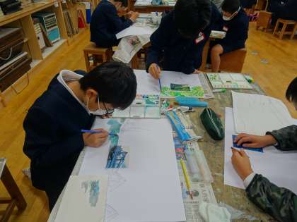 自分のイメージを水彩の混色や塗り方も工夫しながら作品づくりに取り組んでいます。どんなでき上がりになるか、そして互いに見合うのが楽しみです。