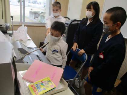 給食時の校内放送インタビューの様子です。この日は、1・3年生男子が、好きな教科や本を答えました。ミニ動画→放送インタビューの様子