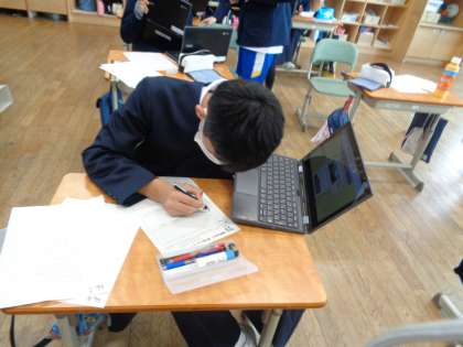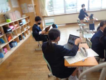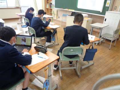 卒業式の呼びかけの言葉をどうするか、今までの学校生活を振り返っています。ホームページを見て、確認する子供の姿もあり、懐かしい写真を見ながら和やかに行っています。