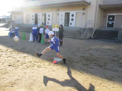 晴れたグラウンドで、3年生が体育でキックベースボールをしました。攻めは思い切りボールをけり、コーンで回ってホームへ帰ってきます。守りは、みんなで「むかで」のようにボールを捕った人の後ろに並びます。