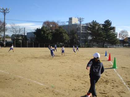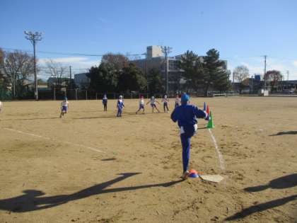 晴れたグラウンドで、3年生が体育でキックベースボールをしました。攻めは思い切りボールをけり、コーンで回ってホームへ帰ってきます。守りは、みんなで「むかで」のようにボールを捕った人の後ろに並びます。