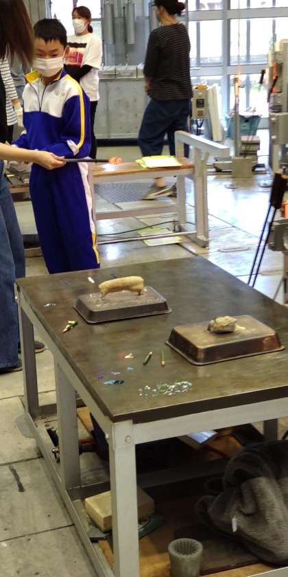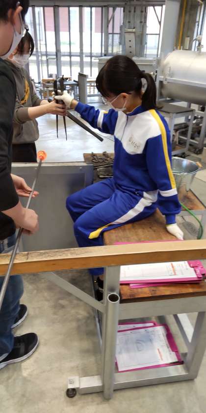 火の中にガラスを入れたり、冷ましながら丸めたりします。きれいにできるかな?