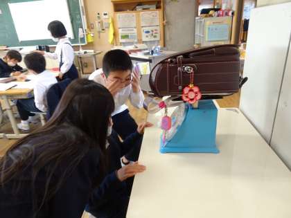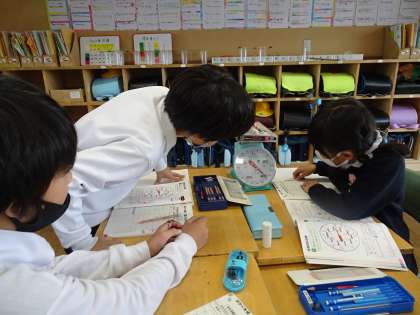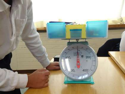はかりの目盛りを正しく読めるようになり、身の回りのものの重さを量りました。重さの見当をつけてから実際の重さを確かめました。また、「1kg」の物を探したり、いろいろな物を組み合わせて「1kg」をつくったりもしてみました。