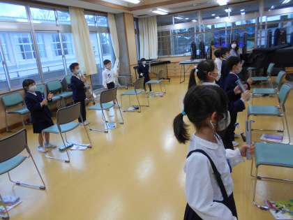 トーンチャイムでジングルベルを演奏しました。自分の音だけを演奏するのではなく、音の重なりにも挑戦しました。ミとドを同時に鳴らした音を聞いて、音の重なりのきれいさに驚いていました。