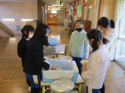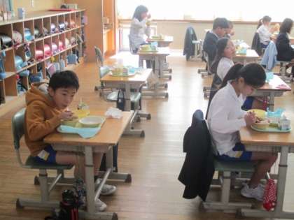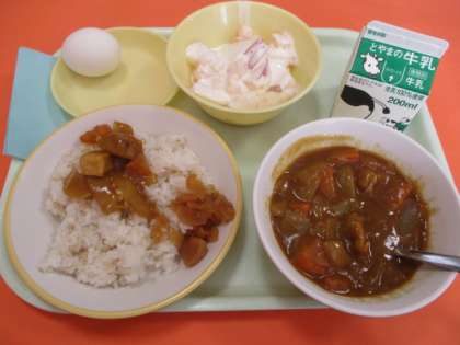 今日の献立は「麦ご飯、カレーライス、ふくしん漬け、ゆで卵、フルーツヨーグルト、牛乳」。画像は、おいしくお代わりをする4年生です。