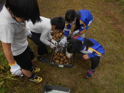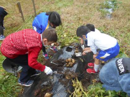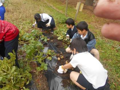 今日は、9月に植えたじゃがいもの収穫をしました。たくさんのじゃがいもが土の中から出てきて、2年生のみんなもとても楽しそうでした。