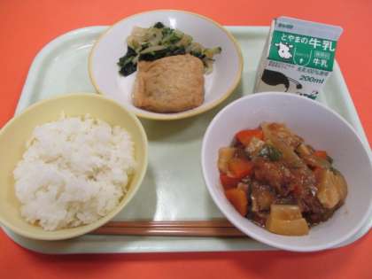 月曜当番の2学期最後の校内放送。給食委員会が紹介した今日の献立は「酢豚、しのだまき(野菜とすりみの油揚げ巻き)、わかめサラダ、ごはん、牛乳」でした。2学期の給食もあと3回です。