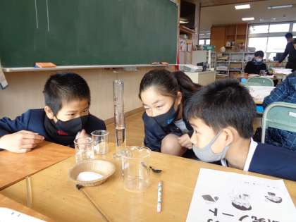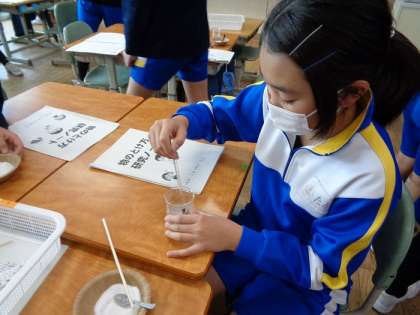 理科では、物が水に溶けるときのきまりについて学習しています。今日は、水の量を変えて、食塩やミョウバンがどのくらい溶けるのかを調べました。