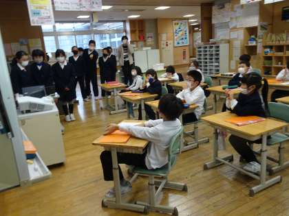 3年生は、総合的な学習の時間に「岩瀬のすてきな人」を見付け、調べたりインタビューしたりしたことを伝える準備をしようと考えています。プレゼンテーションを作るのは初めてなので、5年生の作品を見せてもらいました。「岩瀬の紹介」を写真やスライドの変化等を工夫して作ってあるものを見て、「さすが5年生…」と感動していました。