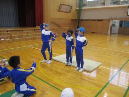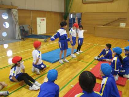 3年生の体育マット遊びでは、「アンテナ」から「ゆりかご」そしてポーズまで決める動きを、ペアやグループで工夫して練習し、見合いました。ミニ動画→アンテナからポーズ1
