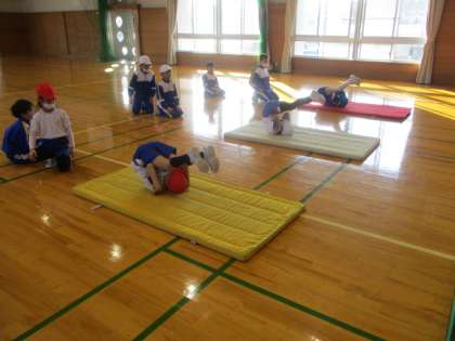 3年生の2学期最後の体育です。マットで、ゆりかごから後ろに足を伸ばして後転をしたり、手を伸ばしたきれいな前転を練習したりしました。冬休み中もできる支え・回り技を学習したので、家庭でなわとびや簡単な運動をしてみるとよいですね。