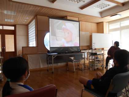 映画のチケットを握りしめて、朝から楽しみな様子でした。1・2年生、桃組のみんなで楽しいビデオ映画を見ました。学校で、たくさんの友達と見るのが初めてだったので、とても嬉しそうでした。