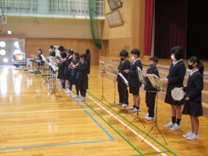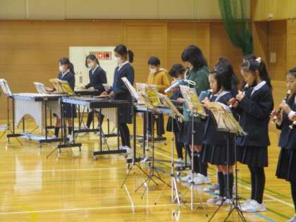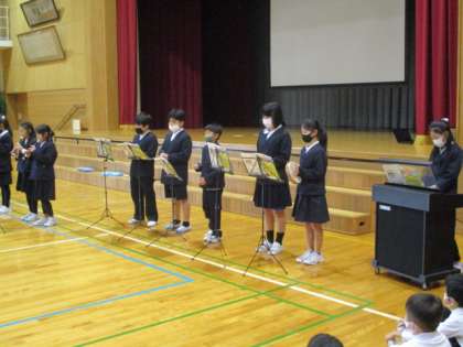 終業式で、4年生が、音楽の時間に練習した合奏を全校児童の前で披露し、クリスマスにふさわしいリズミカルな曲で明るく盛り上げました。