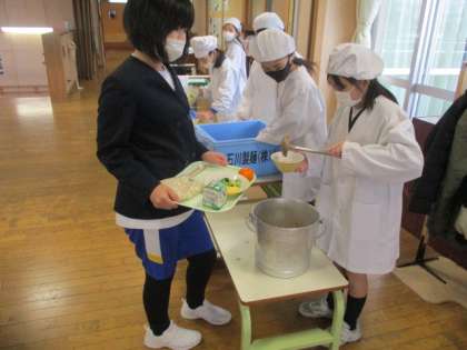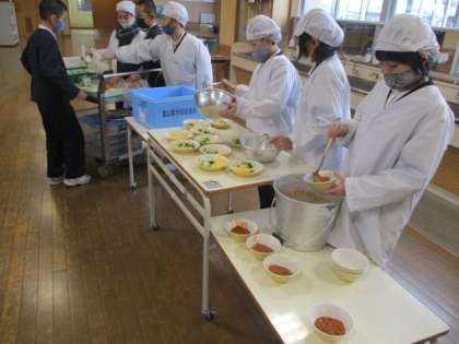 今日の献立は「ソフトめん、ミートソース、オムレツ、花野菜サラダ、みかん、牛乳」でした。画像は、手際よく配膳をする5・4年生。