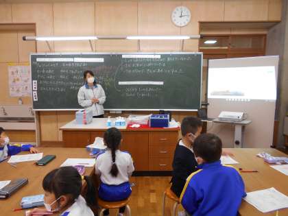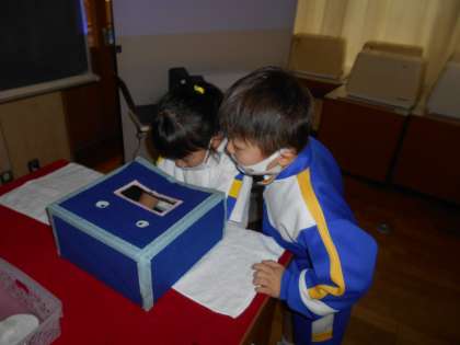 手洗いチェッカーを使用した学習を、保健室の先生と一緒にしました。手洗い後の手を、手洗いチェッカーで見ると、洗えていない部分が白く見えます。「つめが全部白い」「てのこうが洗えていない」「指の間が汚れている」と自分の手洗いを見直す姿が見られました。
