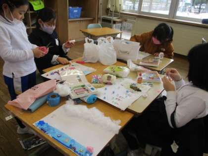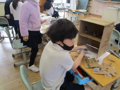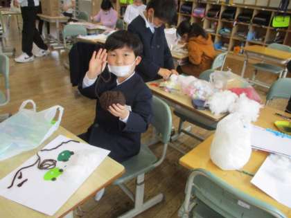 2年生図画工作科「ざいりょうからひらめき」では、段ボール、画用紙、毛糸、綿、ビーズ、ビー球など、持ってきたいろいろな材料を切ったり貼ったりしながら、作品づくりに励んでいます。どんな作品になるのか楽しみですね。