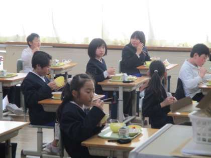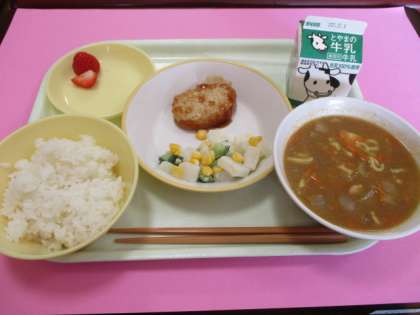 今日の献立は、ちいさなおばけシリーズの物語にちなんだ、「おばけのアッチ豆腐ハンバーグ、のらねこスープ(カレー味)、サイコロサラダ、いちご」でした。
