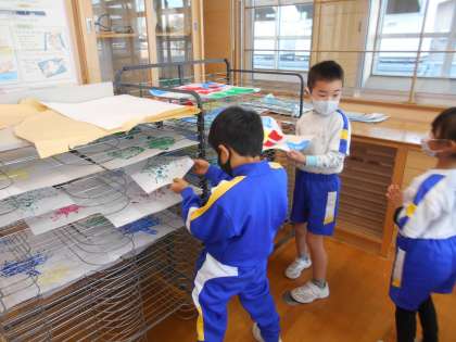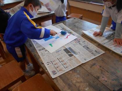 版画作品の背景をローラー、スポンジ等を使って仕上げました。初めての大きな作品でした。絵の具をたくさん使って楽しんでいました。