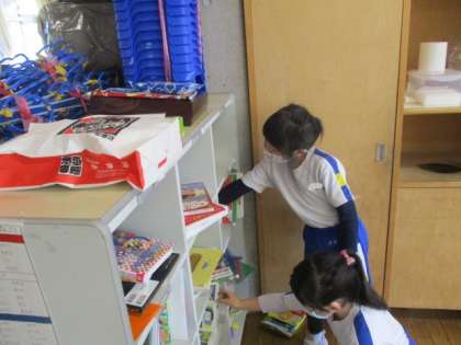 1年生が外国語活動を体験しました。ALTの先生に、いろいろな色に関する英単語を教えていただきながら、教室にある「red」「blue」のものを探すなどして、楽しく外国語に触れることができました。
