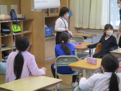 2年生も、外国語活動を体験しました。ALTの先生から、色や動物に関する英単語を教えてもらって、ジェスチャーやクイズを楽しみながら、「red」や「rabit」などの英語に慣れ親しみました。ミニ動画→「何の動物かな?」