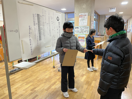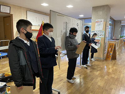 運営集会委員会では、朝の時間に書き損じはがきを集めています。お知らせや放送で呼びかけ、今日までの3日間で50枚ほどのはがきが集まりました。ご協力いただいたみなさん、ありがとうございます。このはがきは、勉強したいと願っている世界の子供たちを応援するために、ユネスコ協会に寄付します。今週の土曜日まで集める予定ですので、ぜひおうちにまだ使っていないはがき、失敗したはがきがありましたら、学校に持ってきていただきたいと思います。よろしくお願いいたします。