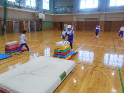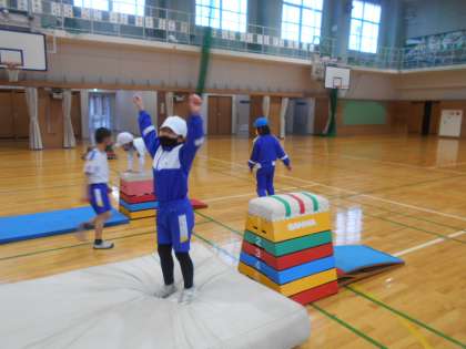 子供たちは体育の学習で、跳び箱を頑張っています。着地まできれいにしようと意識しています。