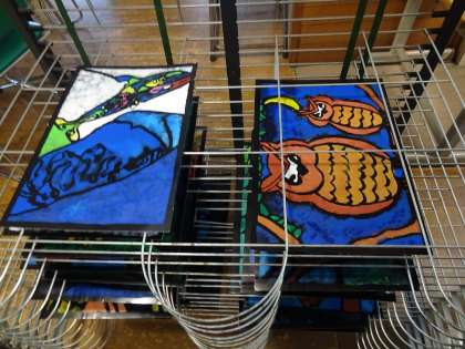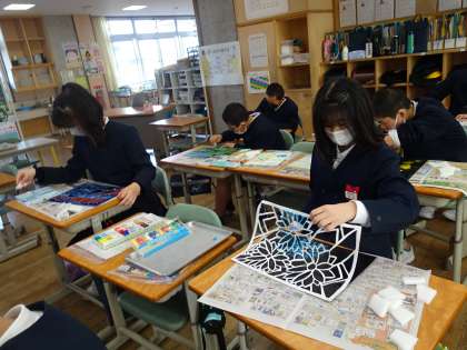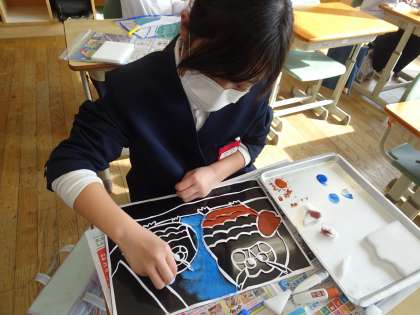 今日は最後の色付けに取り組みました。絵の具に水を混ぜないでスポンジでたたくように色を付けていきました。黒の台紙の上に、少しずつ鮮やかな色が付き、満足したできあがりになった様子でした。