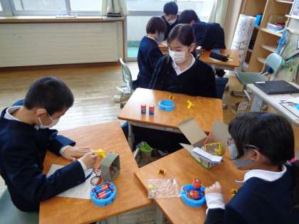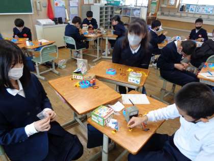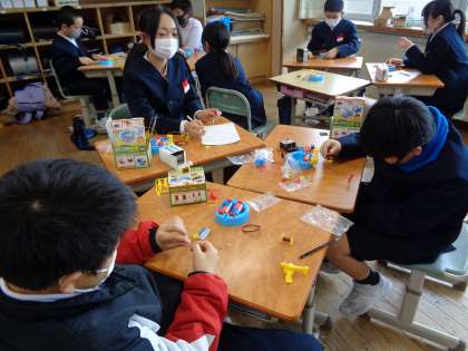 理科の学習では、電磁石を強くするにはどうすればよいか考え、実験を通して確かめました。「電池の数を増やして電流の大きさを大きくしたらどうかな」「コイルの巻き数を増やしてみよう」と予想し、グループごとに実験を行いました。ミニ動画→5年電流1