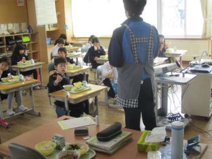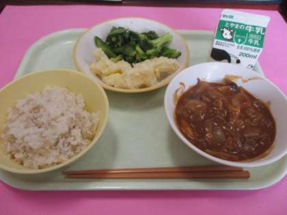 「麦ごはん、ビーフストロガノフ、チーズポテト、グリーンサラダ、牛乳」でした。明日は選択献立の日です。
