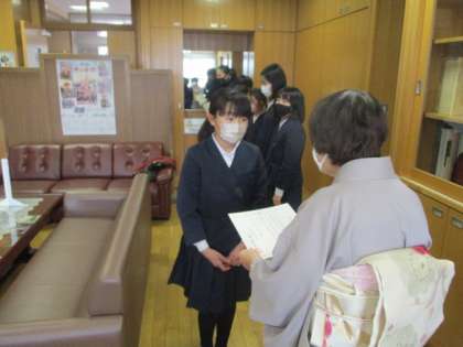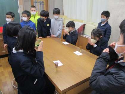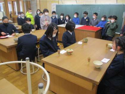 茶道クラブでは、講師の先生に教えていただいて、3年生の前で習ってきたお手前を披露しました。ミニ動画→茶道クラブの様子 その後、先生から1年間がんばった「お印」(証書)をいただきました。