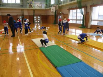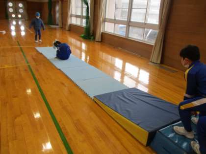 3年生が、今まで練習してきて自分ができるようになった技を組み合わせています。前転、後転、開きゃく、アンテナ、側転、逆立ちなどを、工夫してつなげたり、坂をつくって連続技に挑戦したりしています。次回は発表会をする予定です。ミニ動画→3年マット自由練習