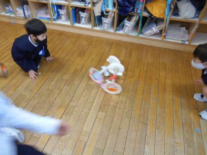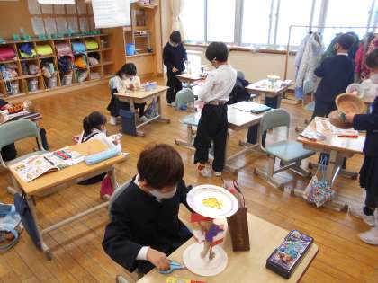 作った作品で遊んでみて、友達の作品のいいところを発表しました。転がしたときに、より綺麗にみえるようにどうしたらいいか考えて、手直ししていました。