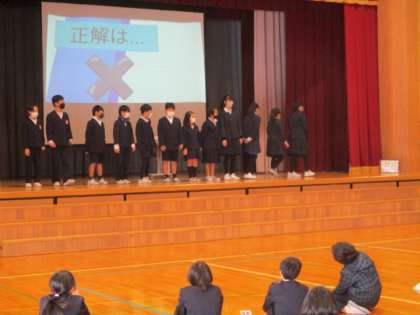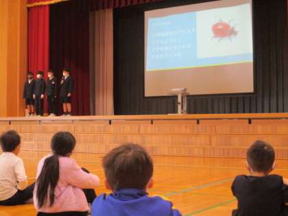 岩瀬タイム(児童集会)では、環境委員会児童が、植物や動物についてのクイズや、正しい清掃の仕方についての呼びかけを行いました。