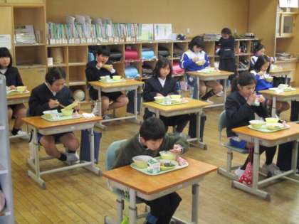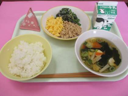 今日の献立は「ごはん、三色丼(とりそぼろ、入り卵、よごし)、すまし汁、ひなあられ」でした。