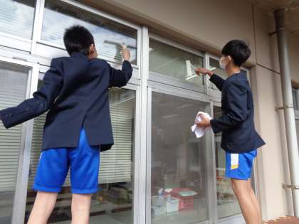 今日は校内清掃グループの企画により、職員室横の窓清掃、1階ウッドデッキ、校長室の掃除を行いました。6年間の感謝を込めて、それぞれに分かれて精一杯取り組んでいる姿が多く見られました。