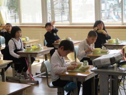 「ごはん、のりつくだに、赤魚の塩焼き、れんこんのきんぴら、豆腐と野菜のうま煮」でした。画像は、お代わりをする4年生と、おいしく食べる2年生。明日から3月です。