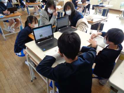 社会科では、自分が興味を持った国のことを、友達に分かりやすく伝える活動を行っています。それぞれの人口や面積を教えたり、自分たちの名前を中国語にしたら、どのような発音になるか教えてくれたりする子供もいました。