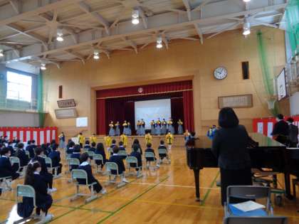 「まだらおどりを、ちいきの人や学校のみんなに見てもらってきんちょうしたけれど、れんしゅうのときとおなじように、できてうれしかったよ。」「学校においわいの気もちをこめて、うたをうたいました。」「5,6年生のおねえさんが、きれいなはかまをきて、おどりをおどっているのがすごかったです。」
