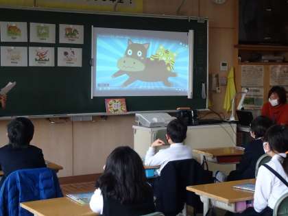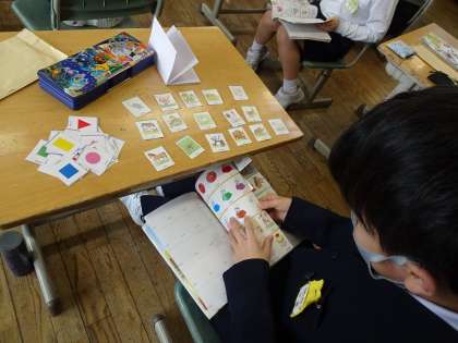 12支のおはなしに出てくる動物の名前の言い方を知り、上手に発音することができるようになりました。また、お話のアニメの動画を見た後、ALTの先生が英語で話をしてくださいました。その後、これらの動物の中から1つ好きなものを選んで、「紹介ブック」を作り始めました。その動物が好きな物や嫌いな物などのカードを貼ったり絵を描いたりしています。次回は、みんなで紹介し合う予定です。