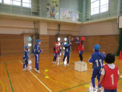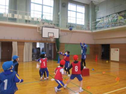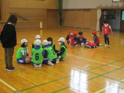 3年生がポートボールで、試合前に作戦を立てたり、チームで分担をして練習したりするなど、工夫しながらゲームに生かしています。