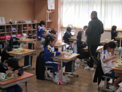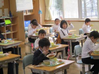 今日の給食は「赤飯、ごま塩、とんかつ、紅白白玉汁、コーンあえ、豆乳プリンタルト」でした。今日のひな祭りや、少し早いですが6年生の卒業を祝う献立です。上の画像は、お代わりをしておいしく食べる2・4年生の子供たち。
