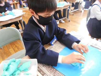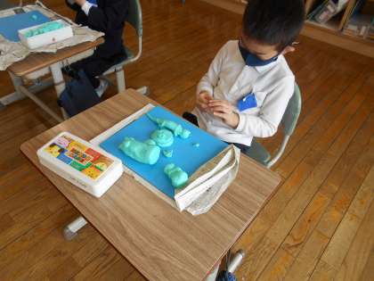 誰といっしょにさんぽするか考えて、作品を作りました。飼っているペット、好きな動物や家族など、誰とさんぽしたら楽しいか考えていました。